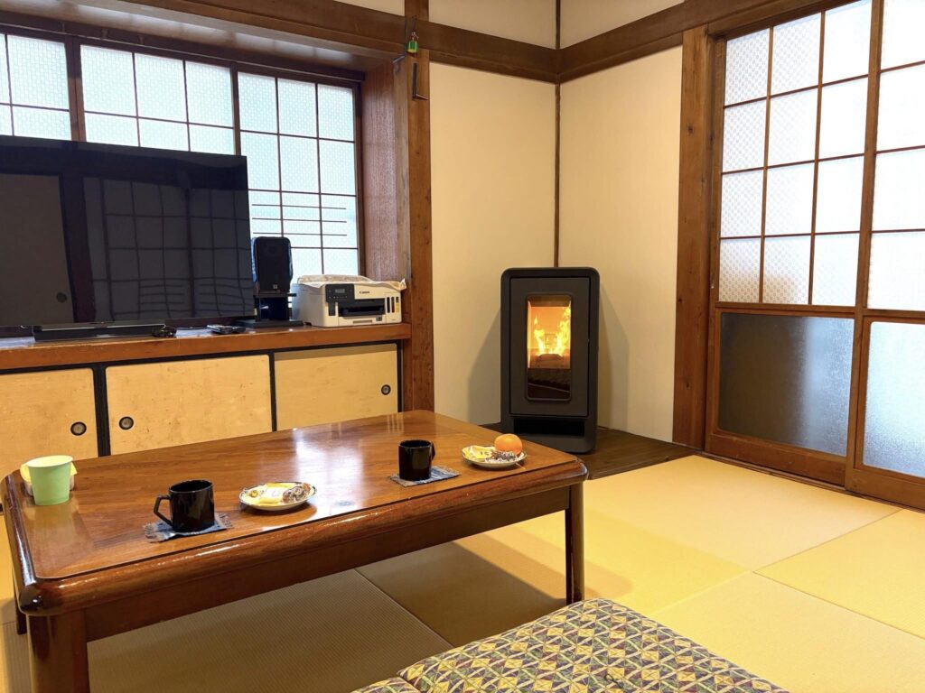 お客様のDIYによって壁の塗り替え、畳の張り替え、炉台の製作をしていただき、最後にペレットストーブの設置で完成したリビングです。